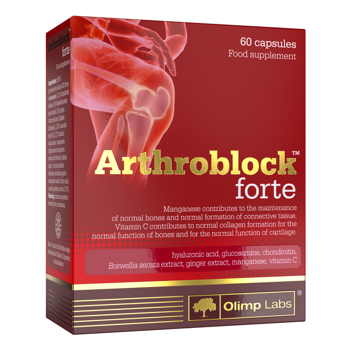 Olimp ARTHROBLOCK® FORTE – food supplement containing ginger extract, Boswellia serrata extract and glucosamine. The product also contains vitamin C which contributes to normal collagen formation for the normal function of bones and cartilage, as well as manganese which contributes to the maintenance of normal bones and normal formation of connective tissue.