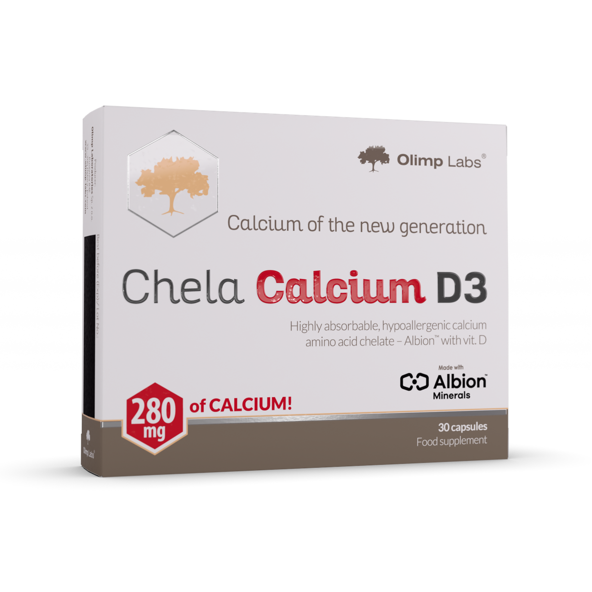 Olimp Chela-Calcium D3 – food supplement in capsules containing highly absorbable form of calcium as calcium amino acid chelate Albion™ (calcium bisglycinate) enriched with vitamin D which contributes to normal absorption and utilisation of calcium.