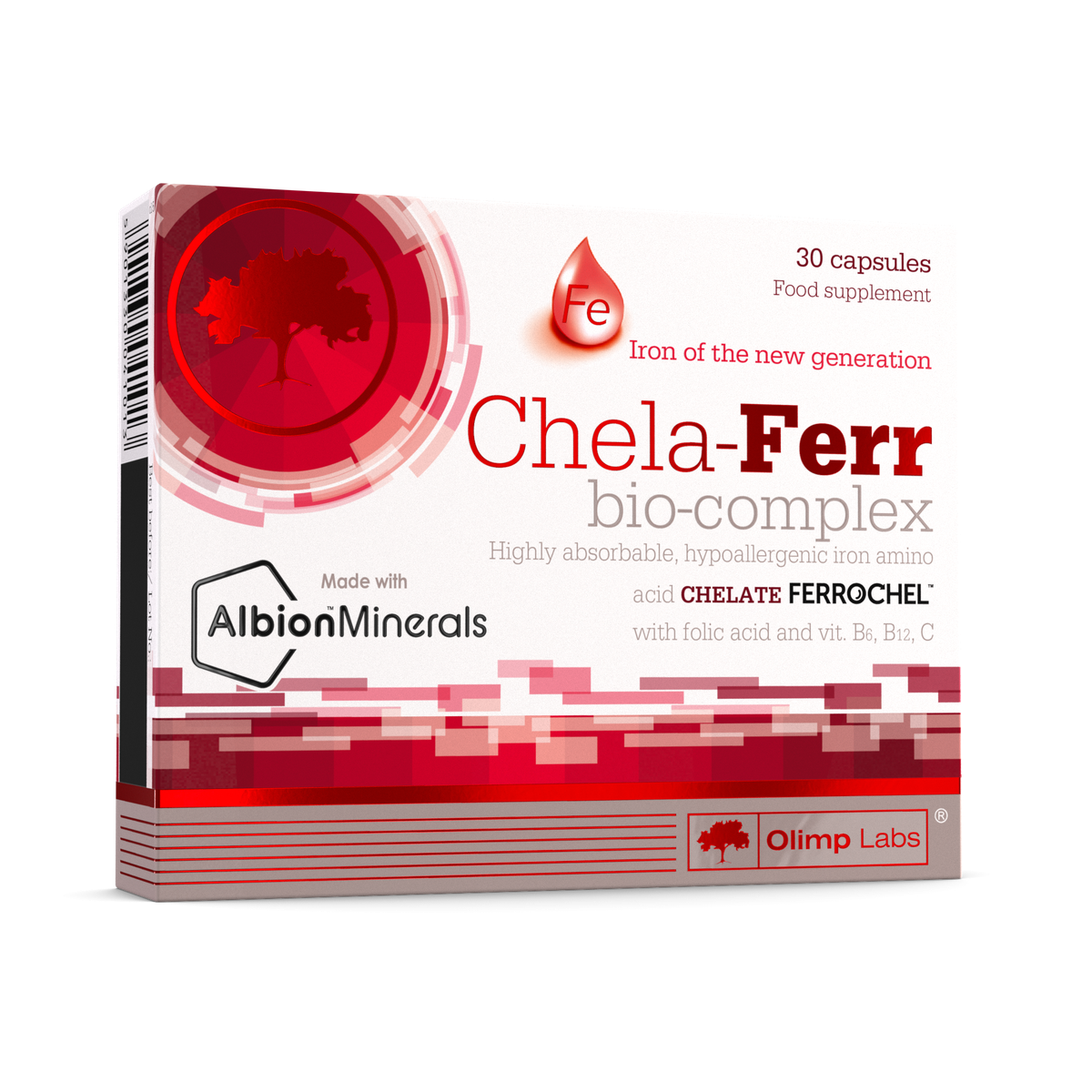 Olimp Chela-Ferr bio-complex – food suplement in capsules containing highly absorbable and safe form of iron as iron amino acid chelate Ferrochel™ (ferrous bisglycinate) in advanced complex with folic acid and vitamins: B6, B12 and C.