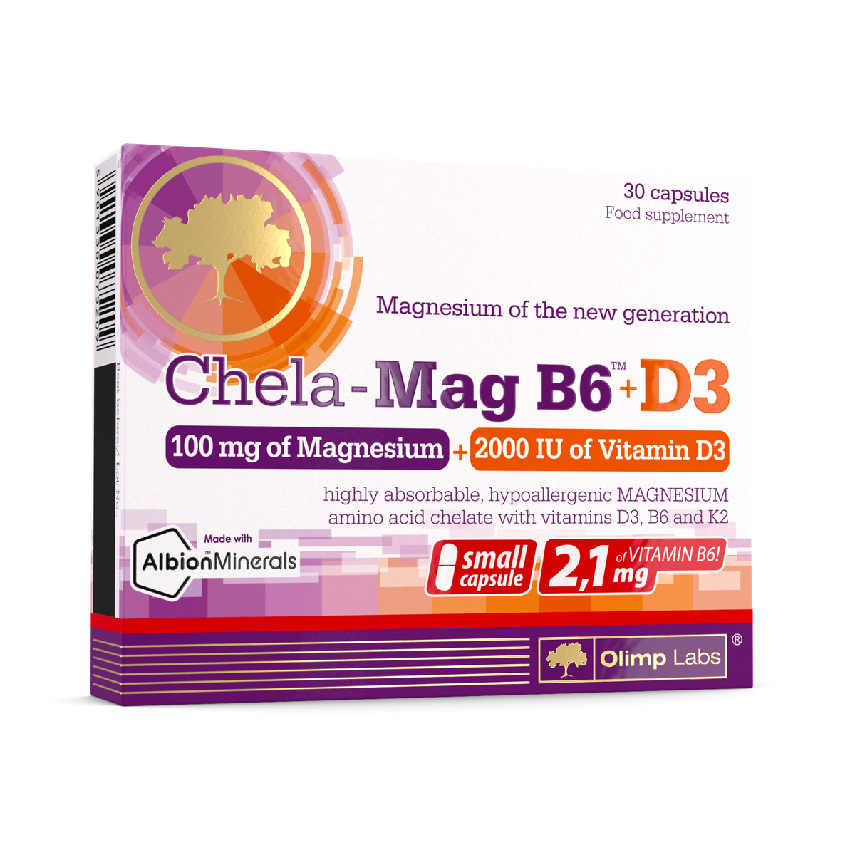 Olimp Chela-Mag B6+D3 – food supplement containing a highly absorbable form of magnesium – amino acid chelate AlbionTM, with vitamin D3 at the level of 2000 IU as well as vitamin B6 and K2. Magnesium plays an essential role in the biosynthesis of vitamin D active form. Scientific research suggests that intake of magnesium from diet or food supplements reduces the probability of vitamin D deficiency in the body and related consequences.¹ Moreover, vitamin D can stimulate intestinal absorption of magnesium.²