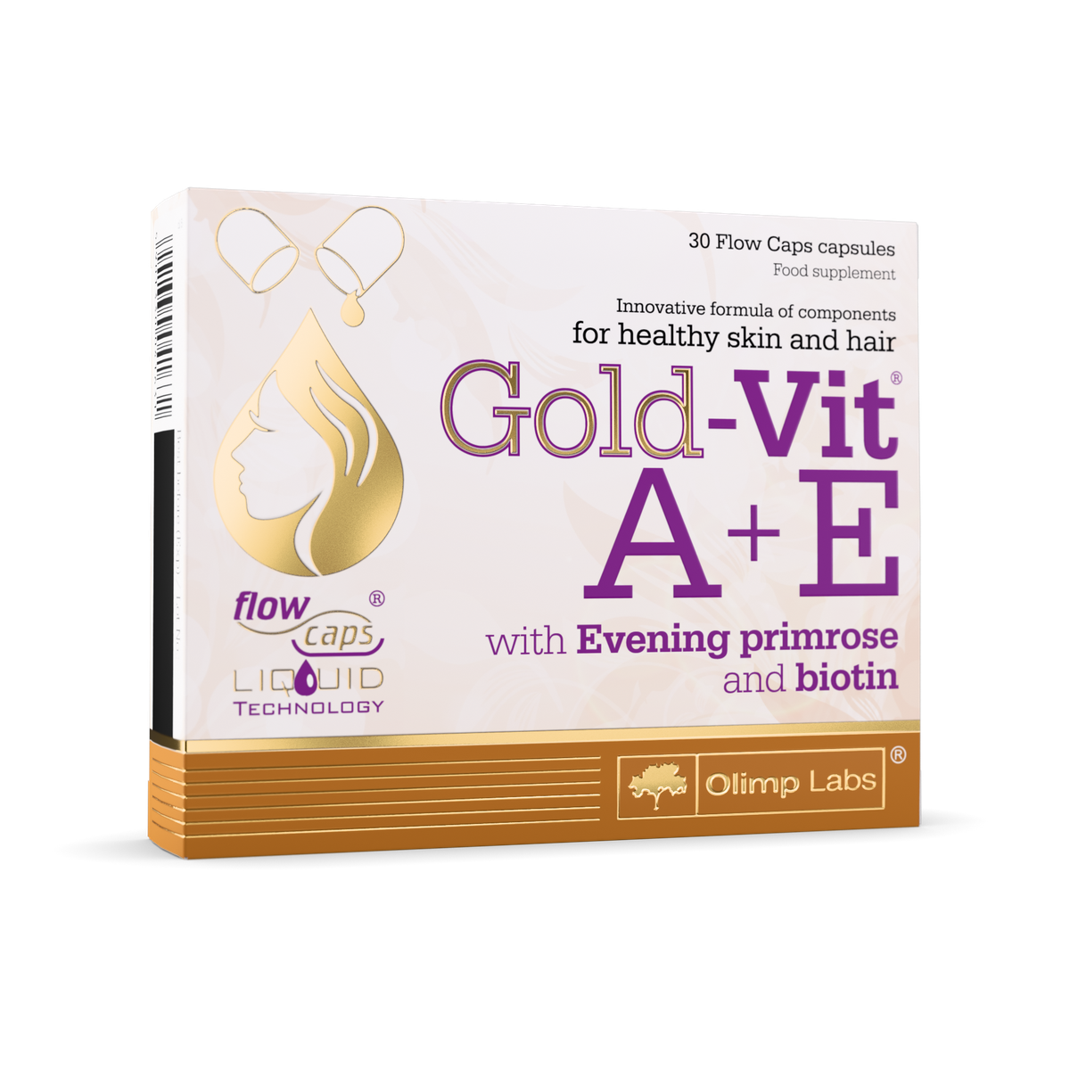 Olimp Gold-Vit A+E with Evening primrose and biotin – food supplement in the form of liquid capsules Flow Caps, which contains Evening primrose oil standardised to the content of gamma-linolenic acid (GLA), and also vitamins A and E as well as biotin.