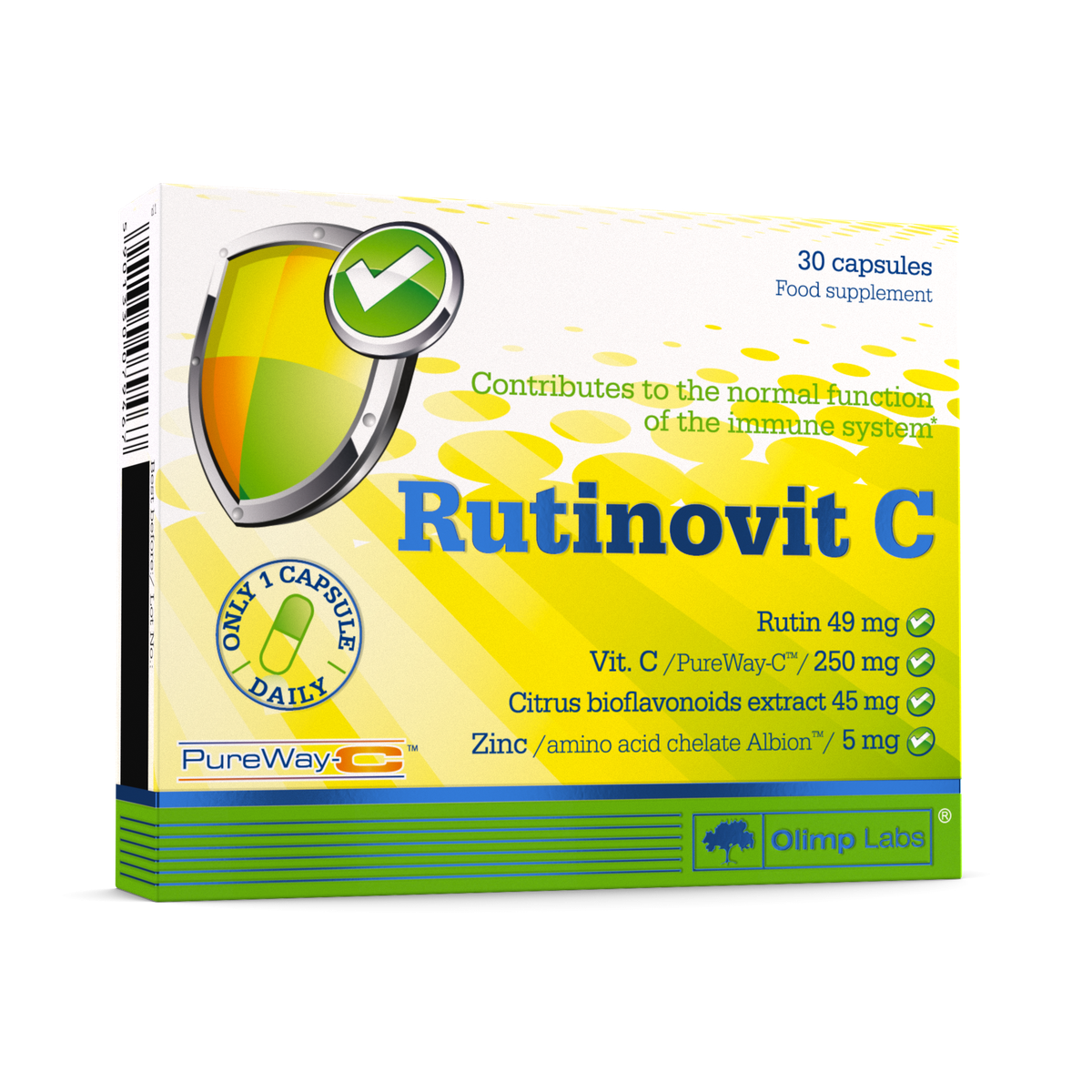 Olimp Rutinovit C – food supplement containing a complex of rutin, citrus bioflavonoids, new generation vitamin C – PureWay-C® and highly bioavailable zinc in the form of the amino acid chelate Albion™. Vitamin C and zinc contribute to the normal function of the immune system.